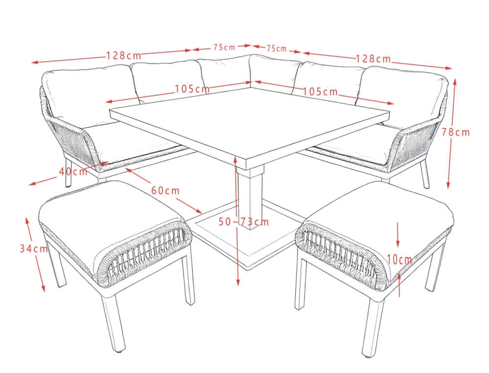 Table: 105 cm (L) x 105 cm (W) x 50–73 cm (H, adjustable)
